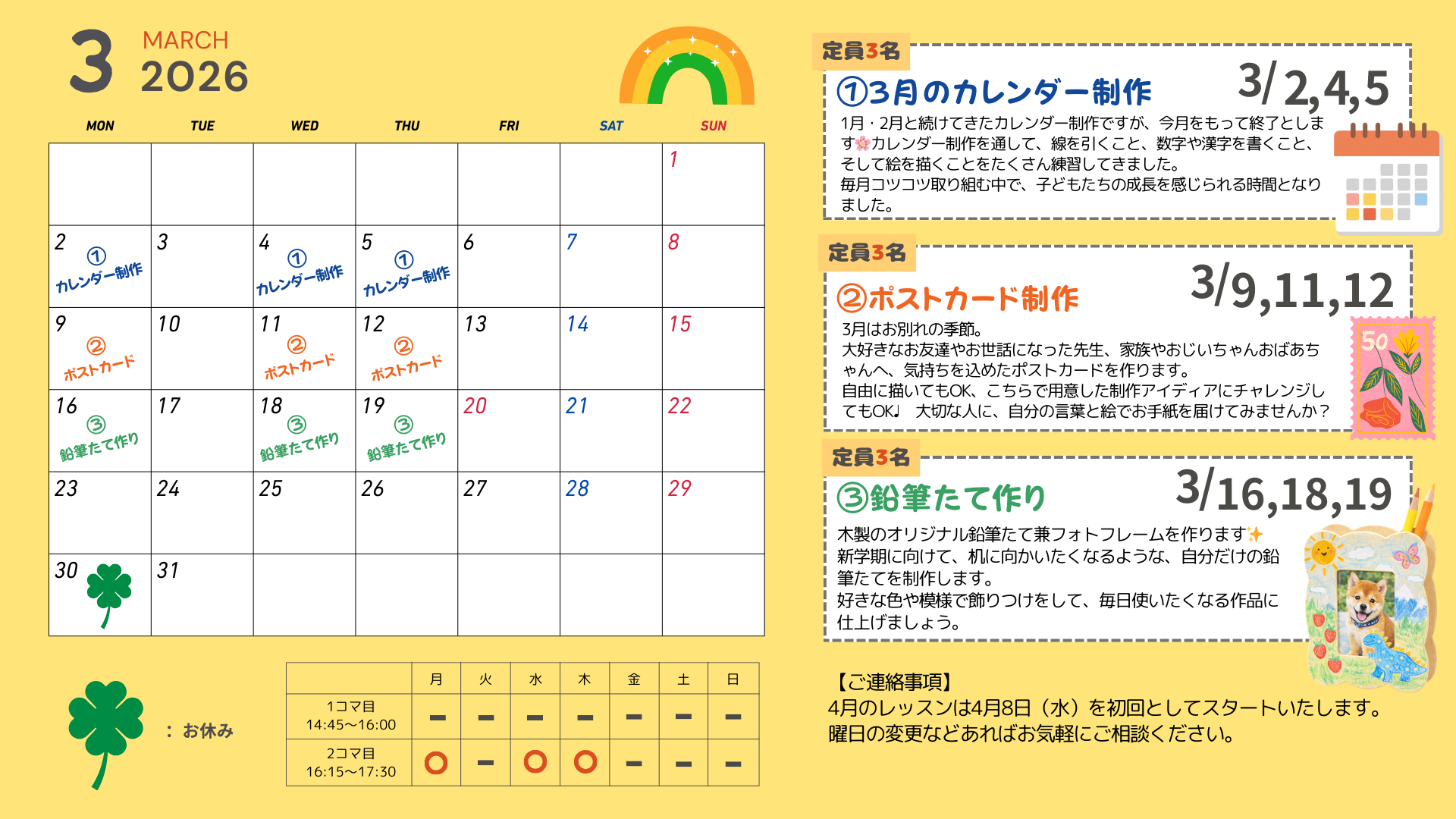 2026年3月のテーマは「カレンダー制作、ポストカード制作、鉛筆たて作り」