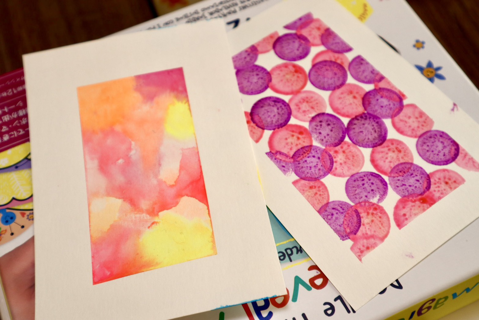 画材は、色鉛筆やクレヨン、カラーインク、アクリル絵の具、水彩絵の具、顔彩、ペンなど、おなじみの画材から初めての画材まで、さまざまのものを使用します。