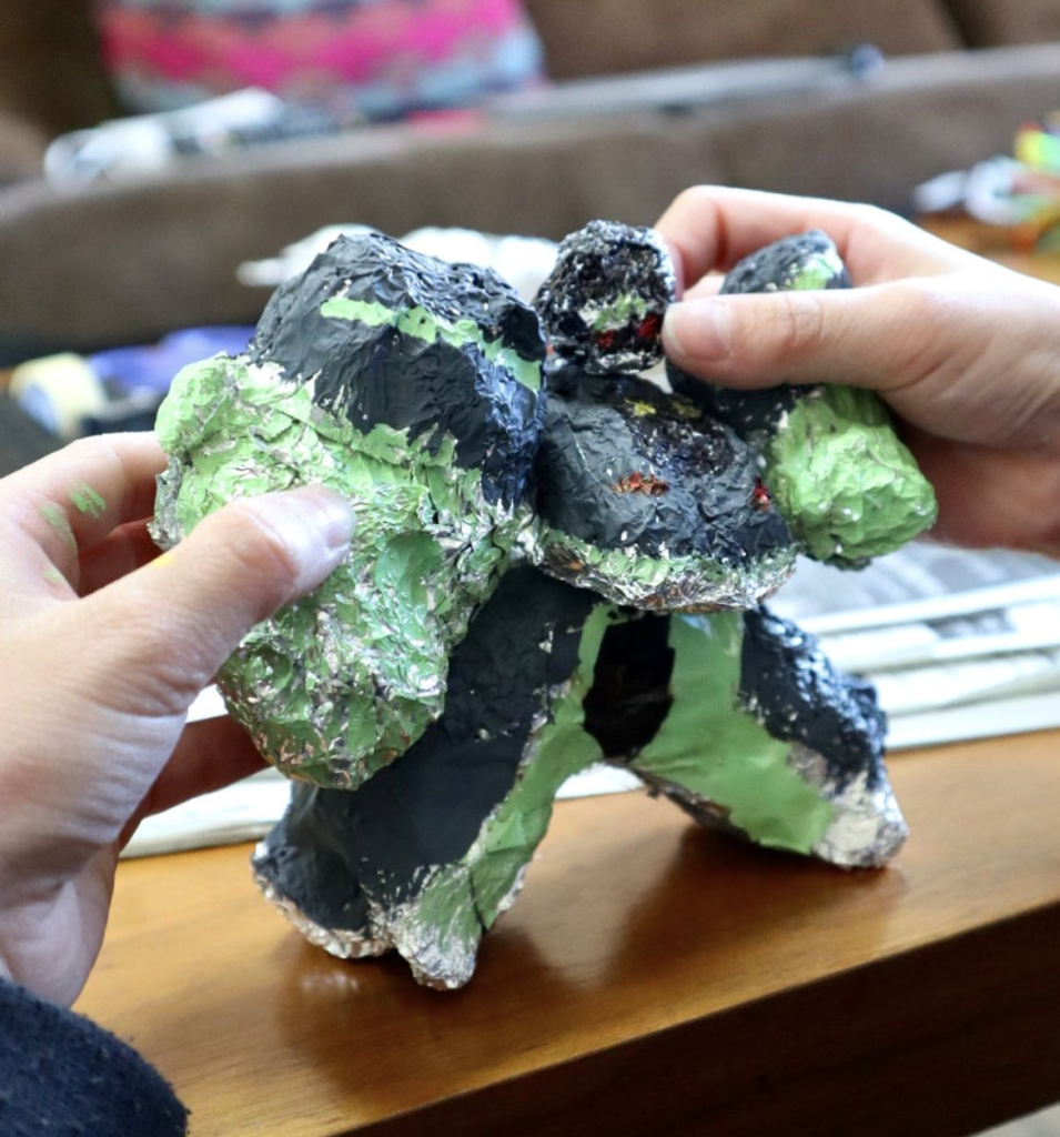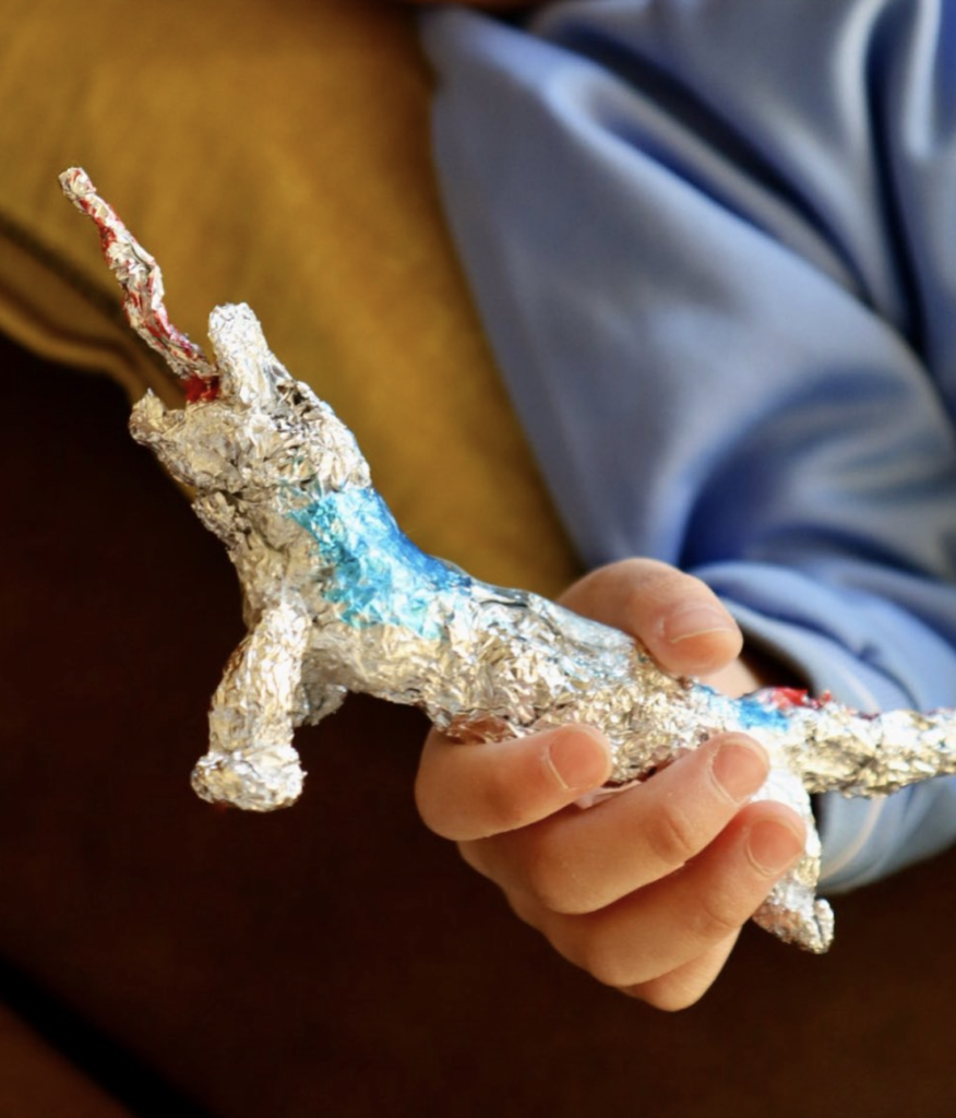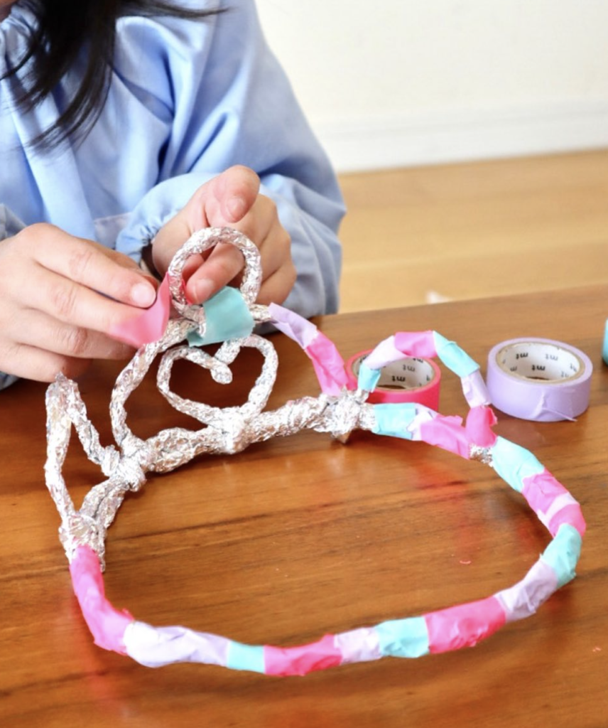 アルミホイルをぎゅっぎゅっと手で押し固めてロボットや雪だるまを作ったり、細長く丸めて組み合わせてキラキラのティアラを作ったり♫