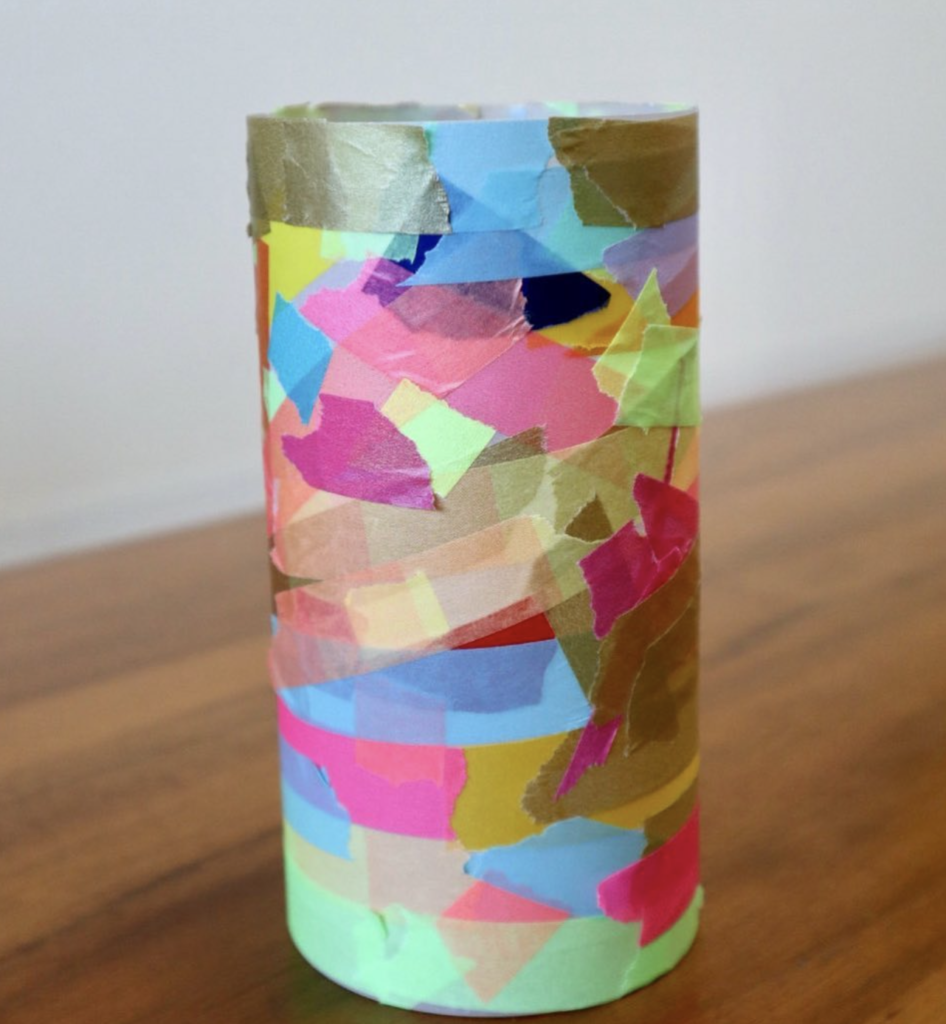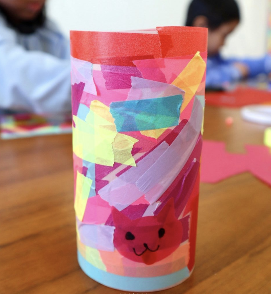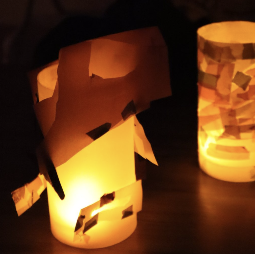 透明フィルムに白のトレーシングペーパーを貼り付け、その上にカラートレーシングペーパーを切り貼りしたり、マスキングテープをちぎって貼ったりして飾り付けしました🧡
