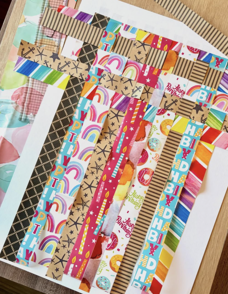 いろいろな色や模様の包装紙を細くカットして、